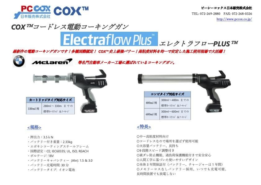 最新の電動コーキングガン、COX新エレクトラフローPLUSは常にパフォーマンス優秀な機器として知られていますが、今回のエレクトラフローPLUSはCOX史上最強の電動コーキングガンとなっています。多種多様な国際認証を受け、高粘度材料を使う現場でも大活躍。大容量バッテリーの使用により長時間作業ができ、均一で安定した施工が可能です。今回のエレクトラフローPLUSは、カートリッジとソーセージパックの併用タイプで、中〜高粘度材料向けの使用が可能です。